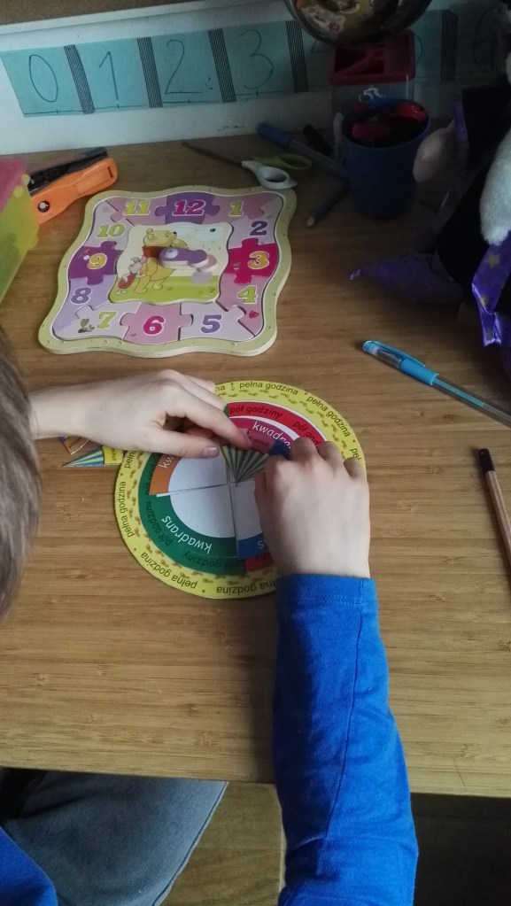 - Naukę rozłożenia godzin na cyferblacie.